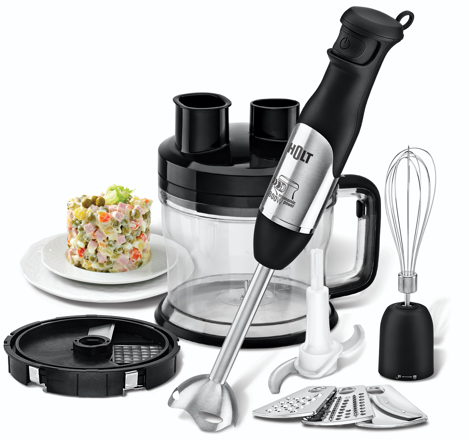 Насадки измельчитель (чаша измельчителя 1,75 л, нож), венчик из нержавеющей стали, насадка-блендер с крестообразным ножом из высококачественной нержавеющей стали, насадка для нарезки кубиками, насадка для шинкования, терка мелкая, терка для драников