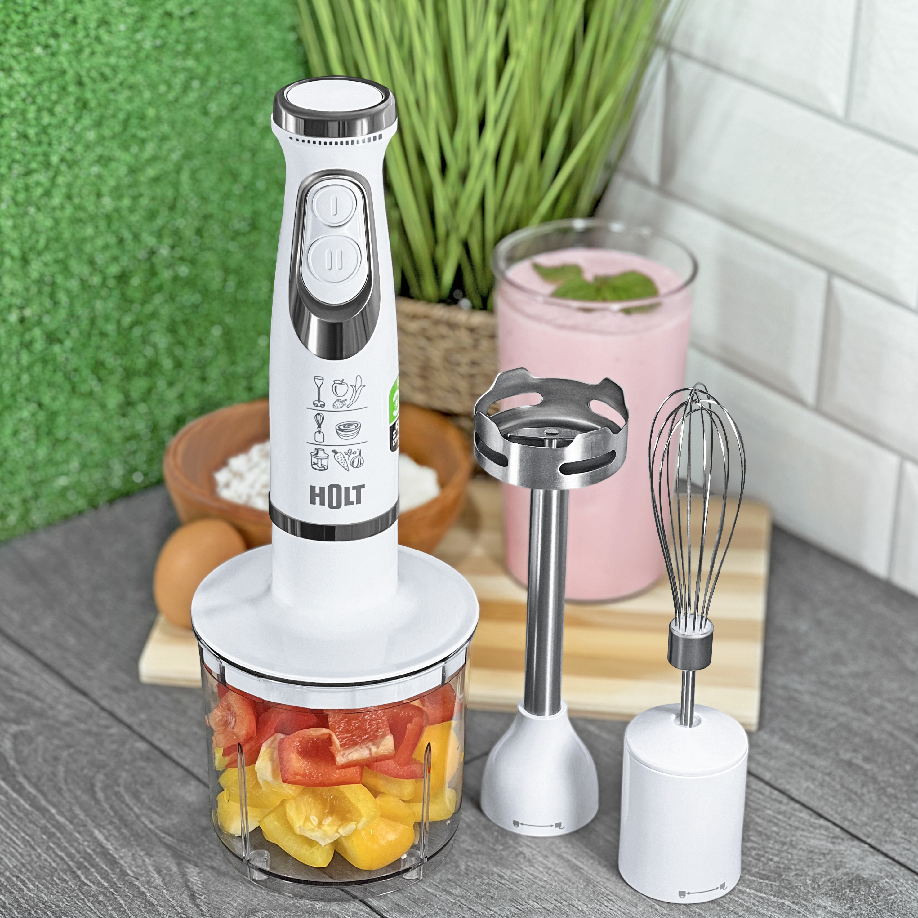 Насадки венчик из нержавеющей стали, чаша измельчителя 500 мл, нож измельчителя, насадка-блендер с ножом из высококачественной нержавеющей стали, мерный стакан 700 мл.