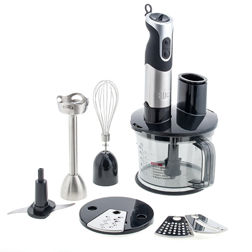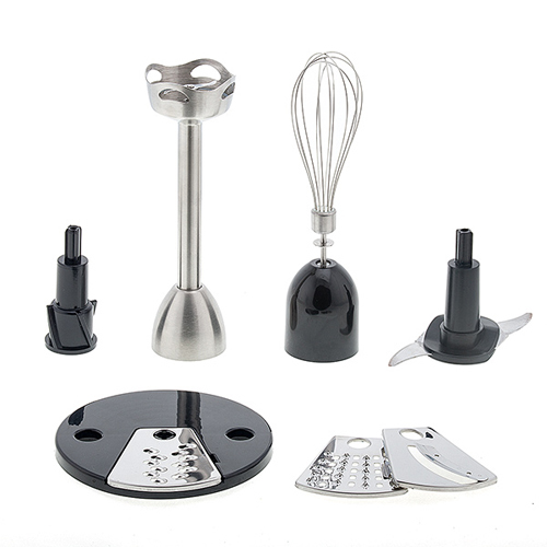 Аксессуары: металлическая насадка-блендер, венчик из нержавеющей стали, нож чоппера, насадка для измельчения, насадка для шинкования, насадка для драников.