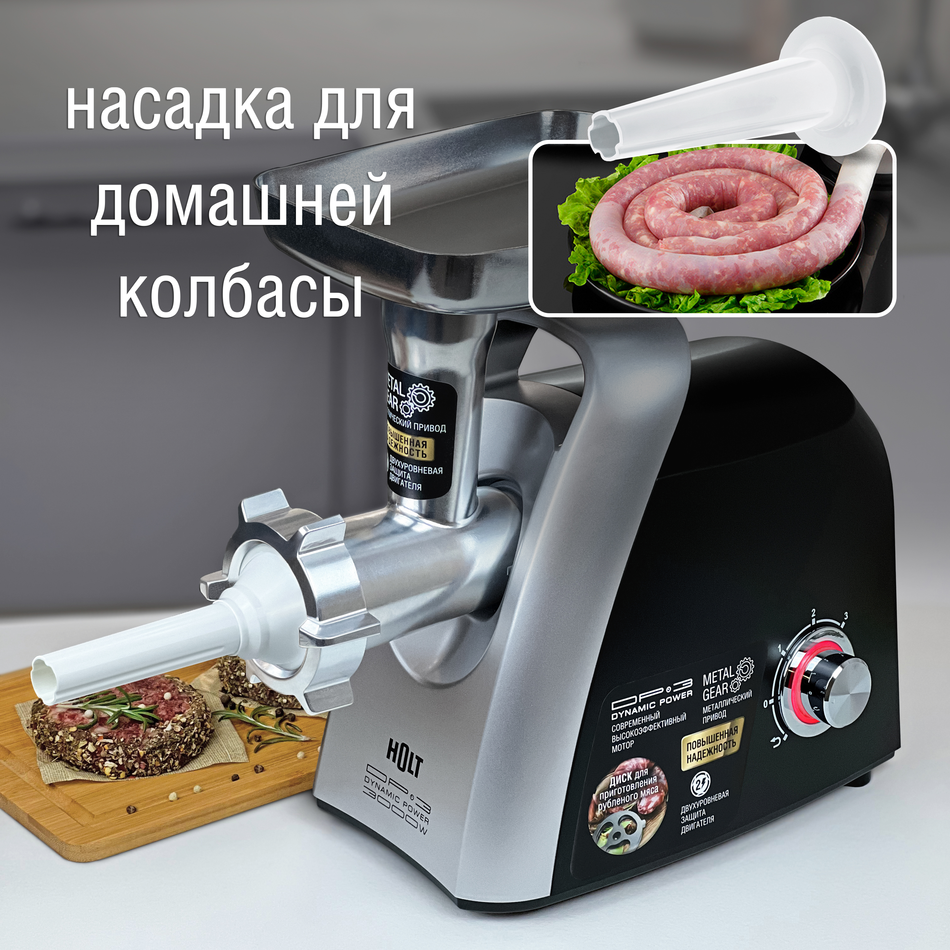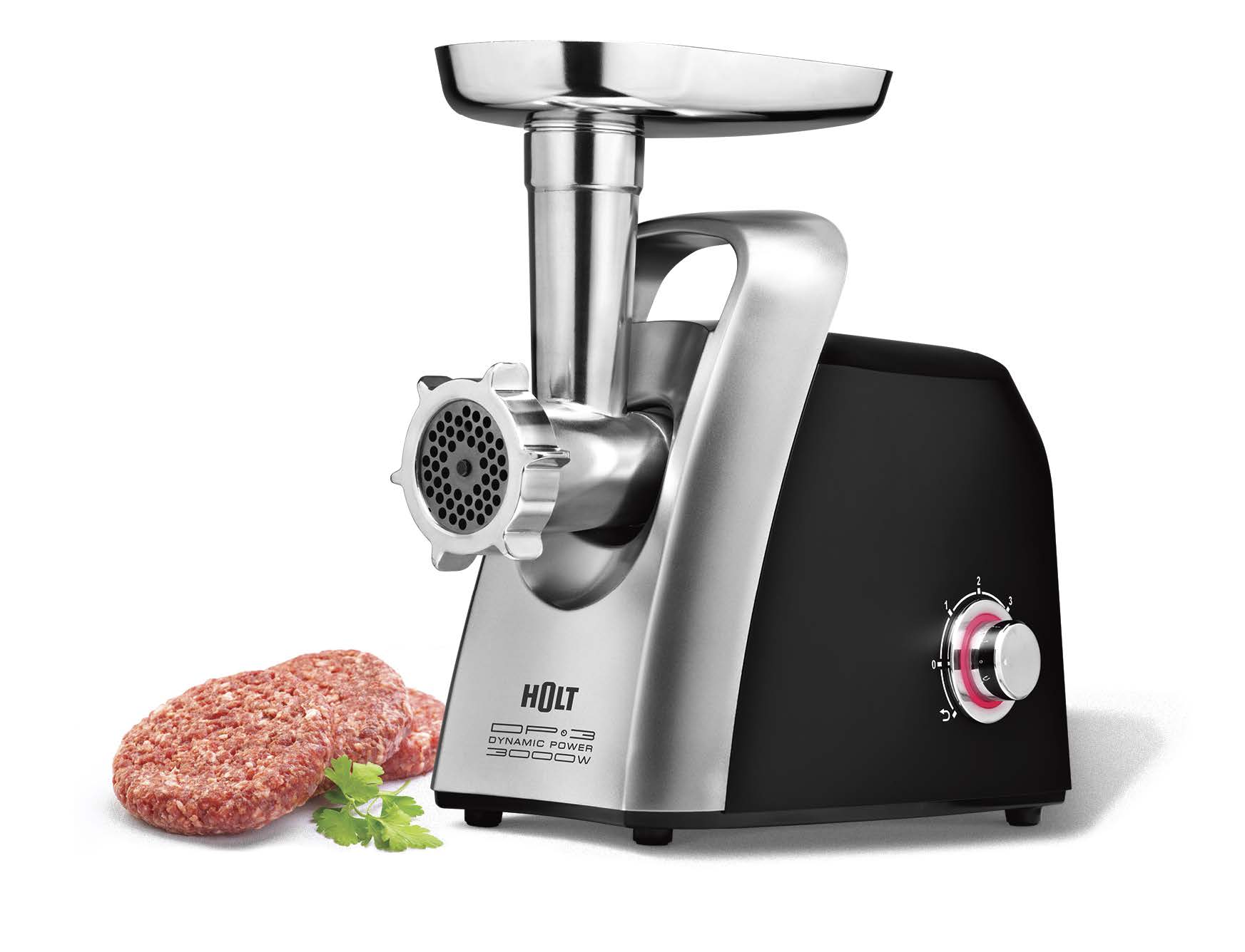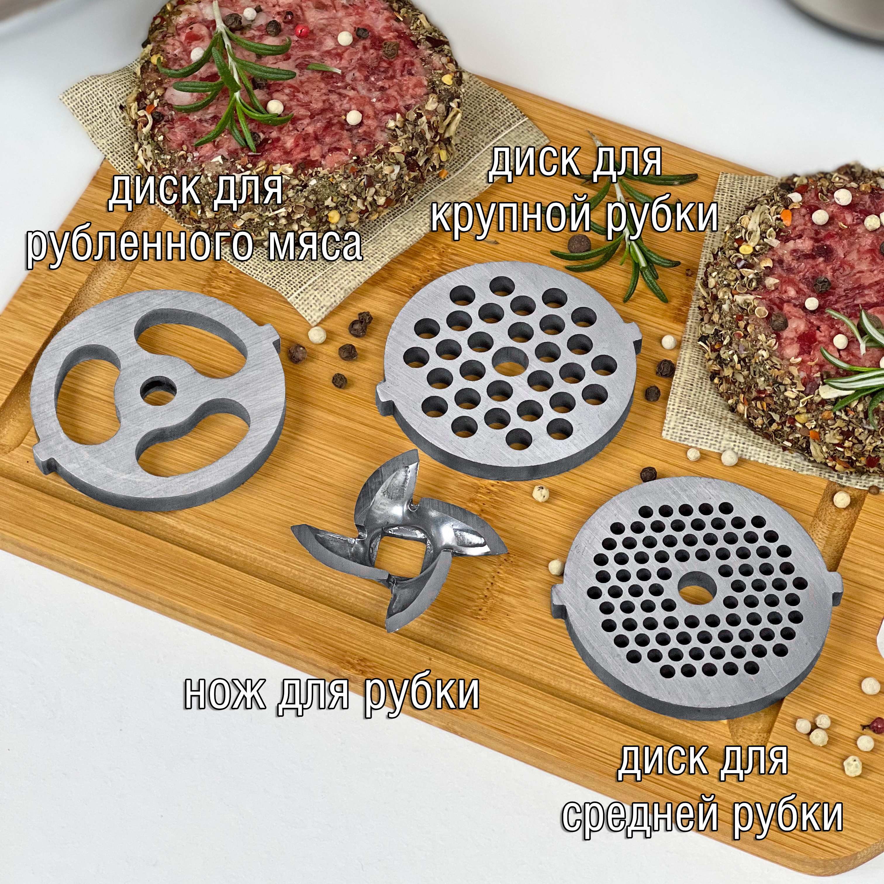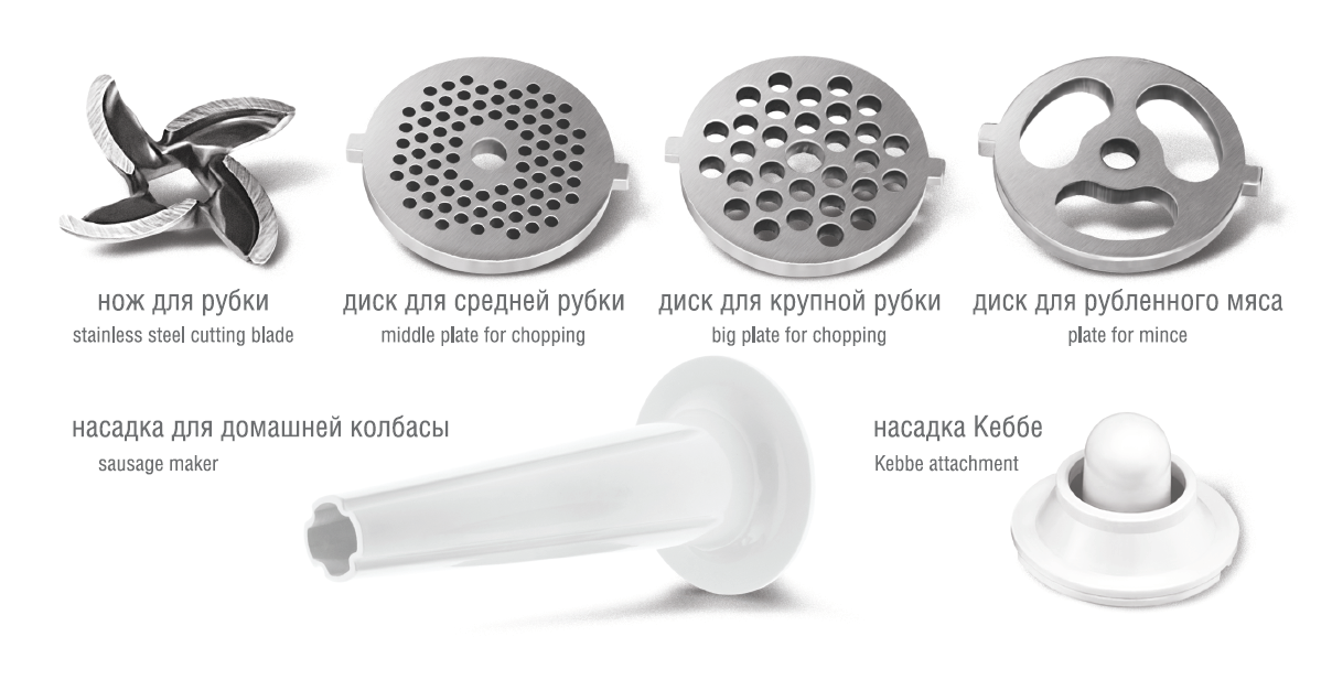 Аксессуары: 1 нож из нержавеющей стали, 3 формовочных диска (диск для мелкой рубки, диск для средней рубки, диск для крупной рубки), 1 насадка для домашней колбасы, 1 насадка кеббе, толкатель
