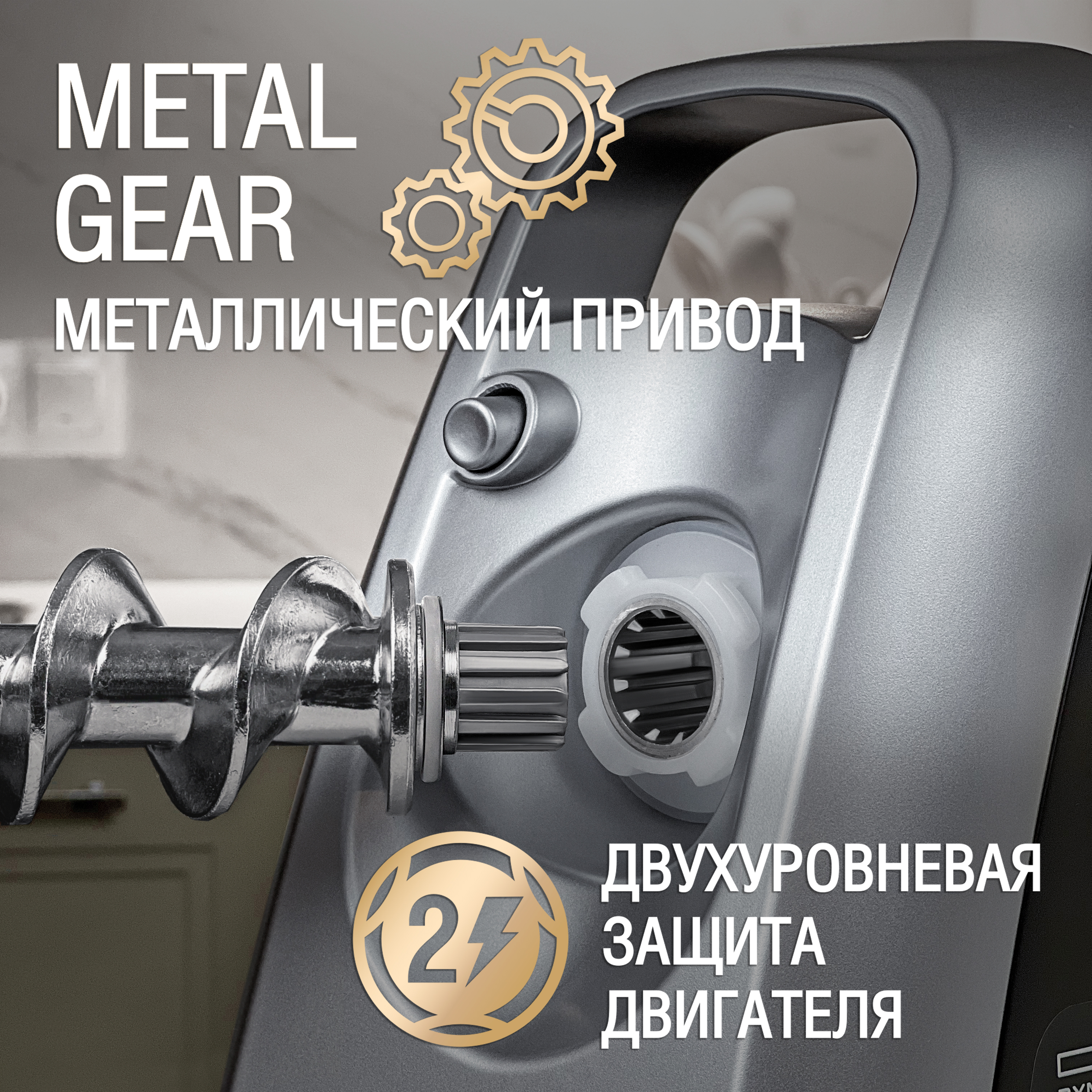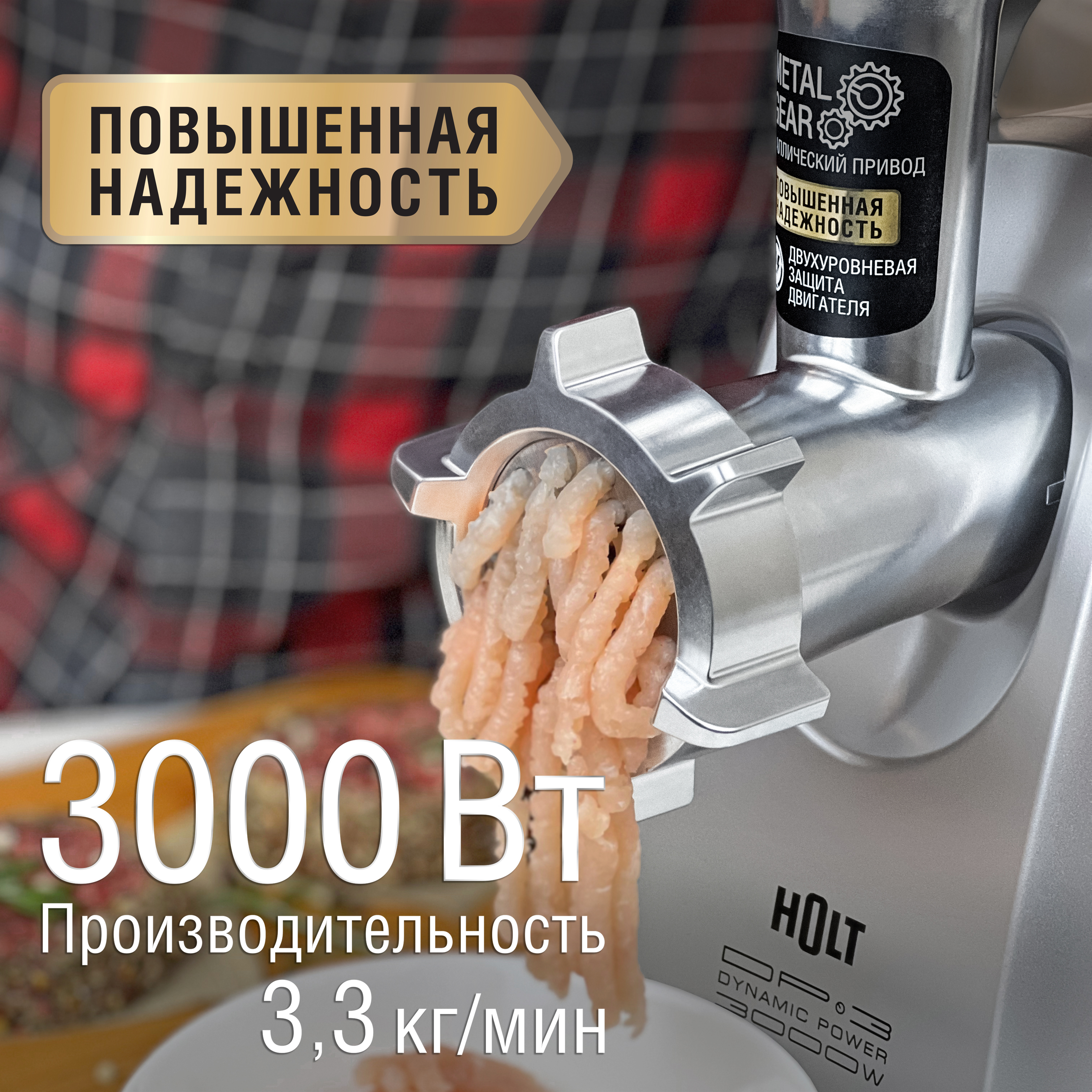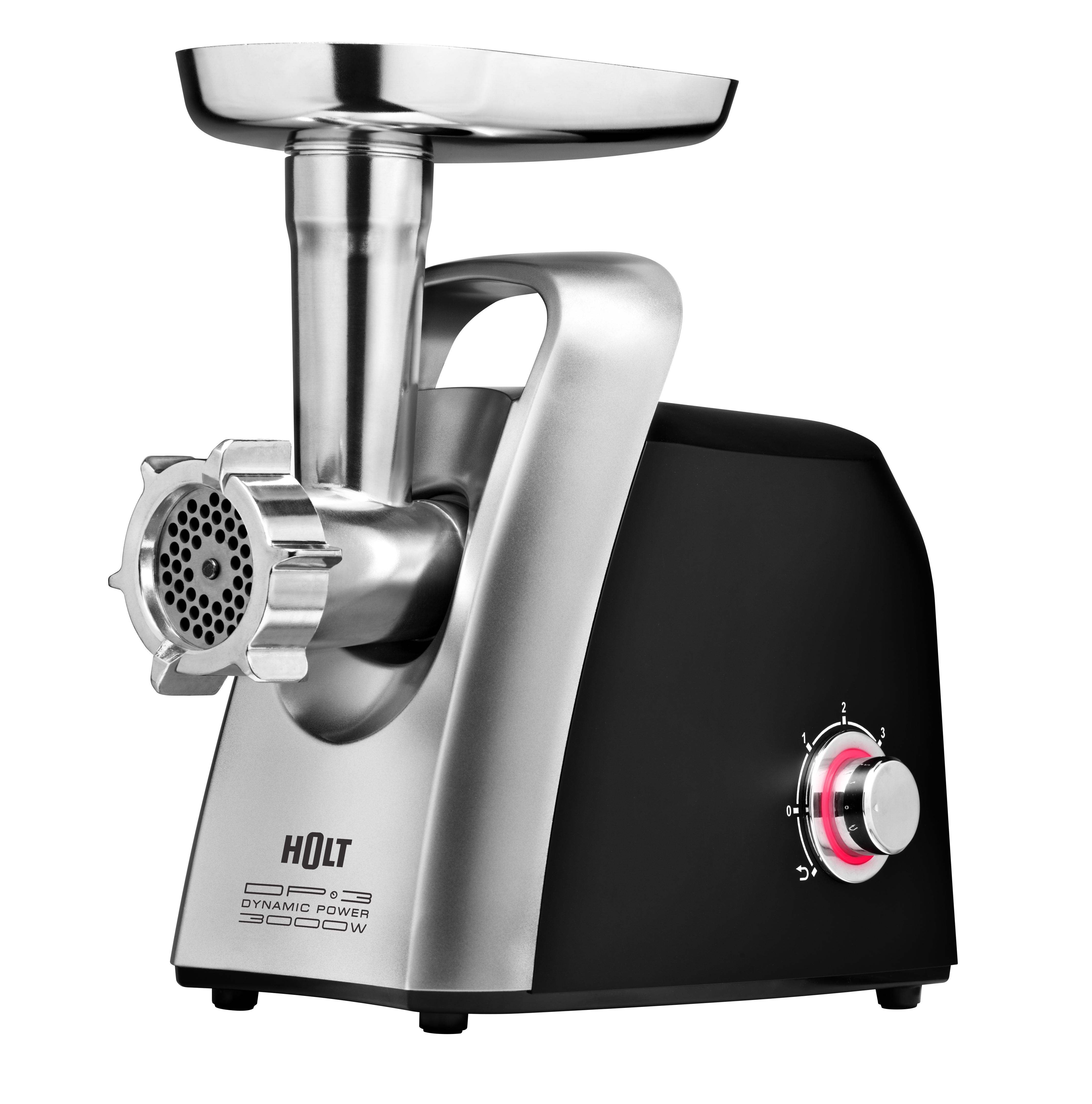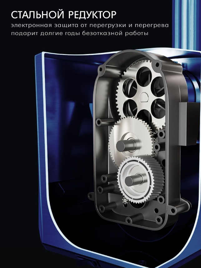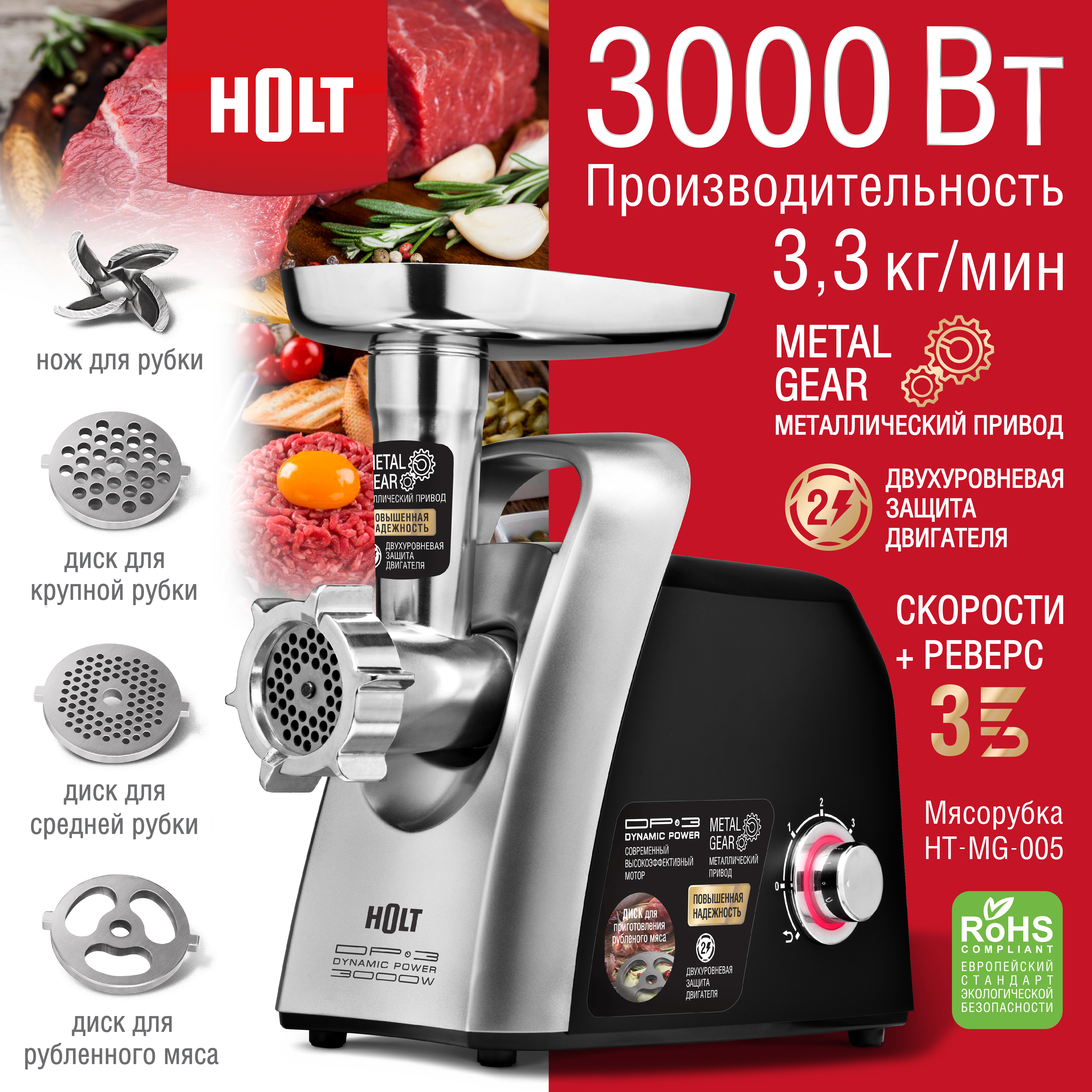 Аксессуары: 1 нож из нержавеющей стали, 3 формовочных диска (диск для мелкой рубки, диск для средней рубки, диск для крупной рубки), 1 насадка для домашней колбасы, 1 насадка кеббе, толкатель