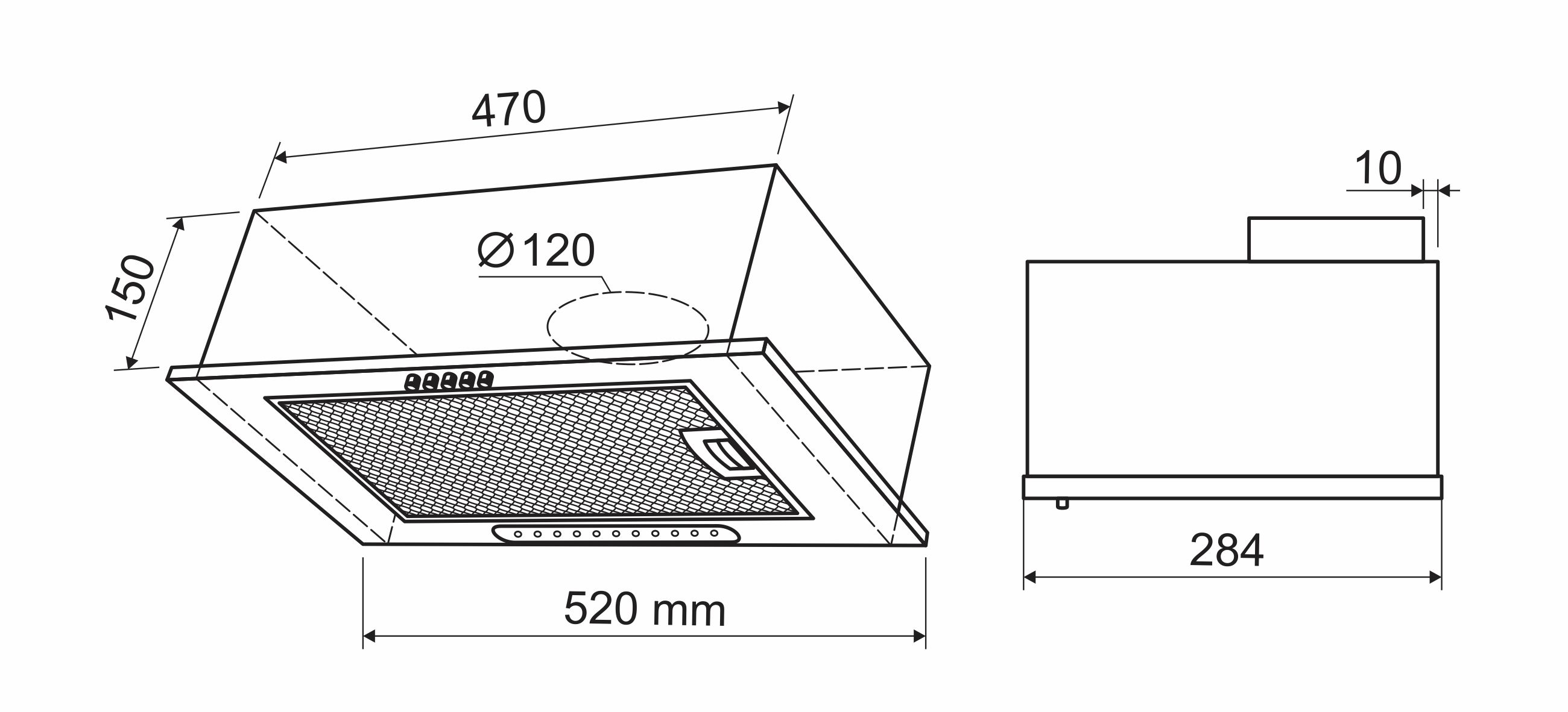 Размер вытяжки: 520х277х150 мм
